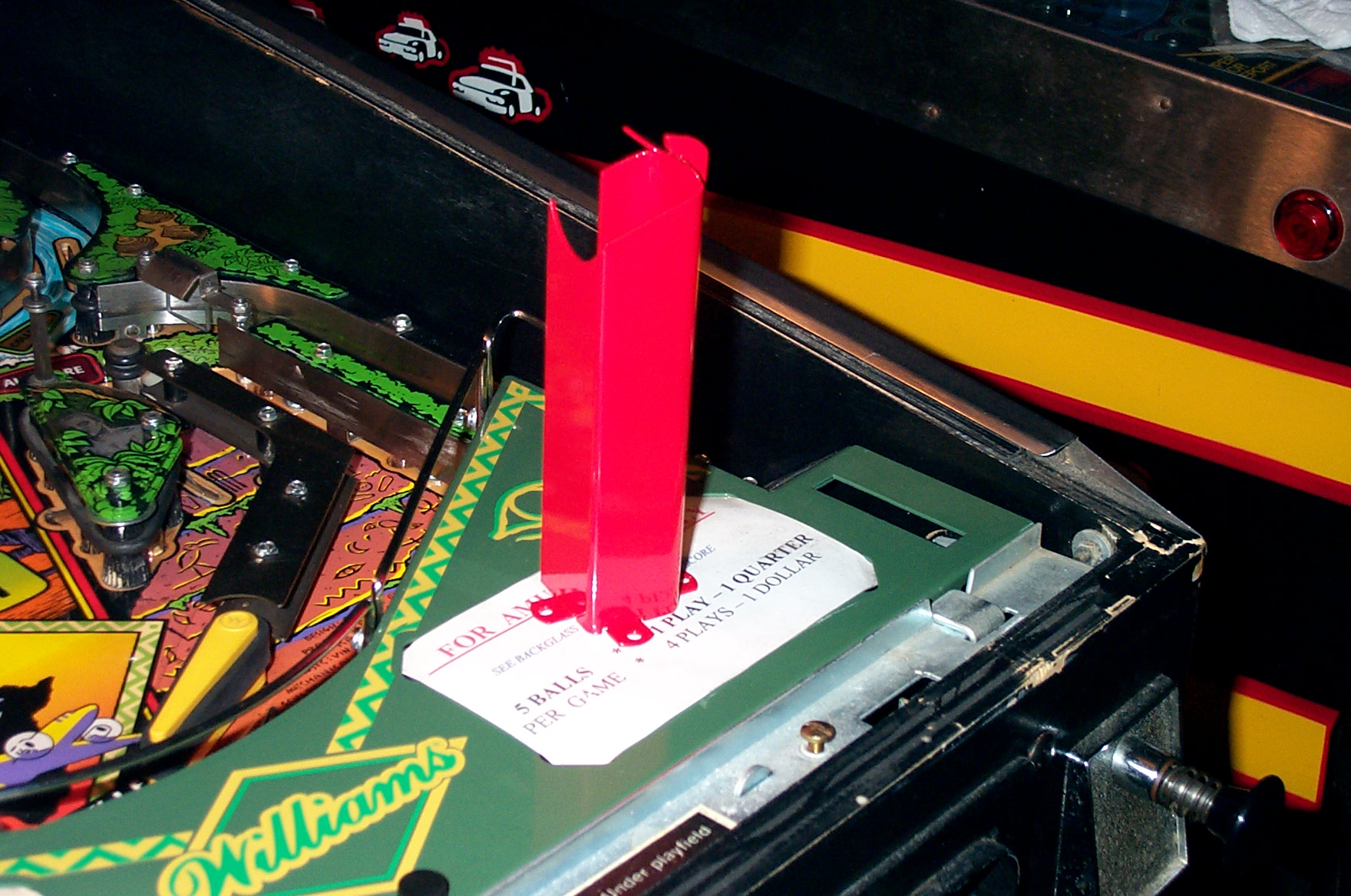 Ok, so when we got the congo, I noticed that when the volcano shot out the pinballs for multi-ball, they just went all over the playfield. After getting down to the chute I saw that the metal flap was almost broken off as well as pointing straight up. Well I knew this wouldn’t cut it, so I came up with a good “jerry rig”. I essentially took a small piece of metal and added it to the back of the flap and main chute body. The welding was my 1st attempt and it looked like it. After some grinding things looked ok. I’m positive that this will not move or break there again.